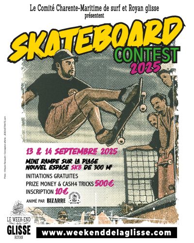 Élaborés et animé par Bizarre Skateboards et 36trip Skateboard La Rochelle, le 𝗦𝗸𝟴 𝗖𝗢𝗡𝗧𝗘𝗦𝗧 aura lieu sur 2 jours les 𝟭𝟯 𝗲𝘁 𝟭𝟰 𝘀𝗲𝗽𝘁𝗲𝗺𝗯𝗿𝗲 𝟮𝟬𝟮𝟱 sur la plage et sur l’esplanade de Pontaillac
